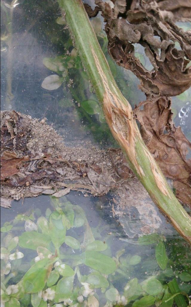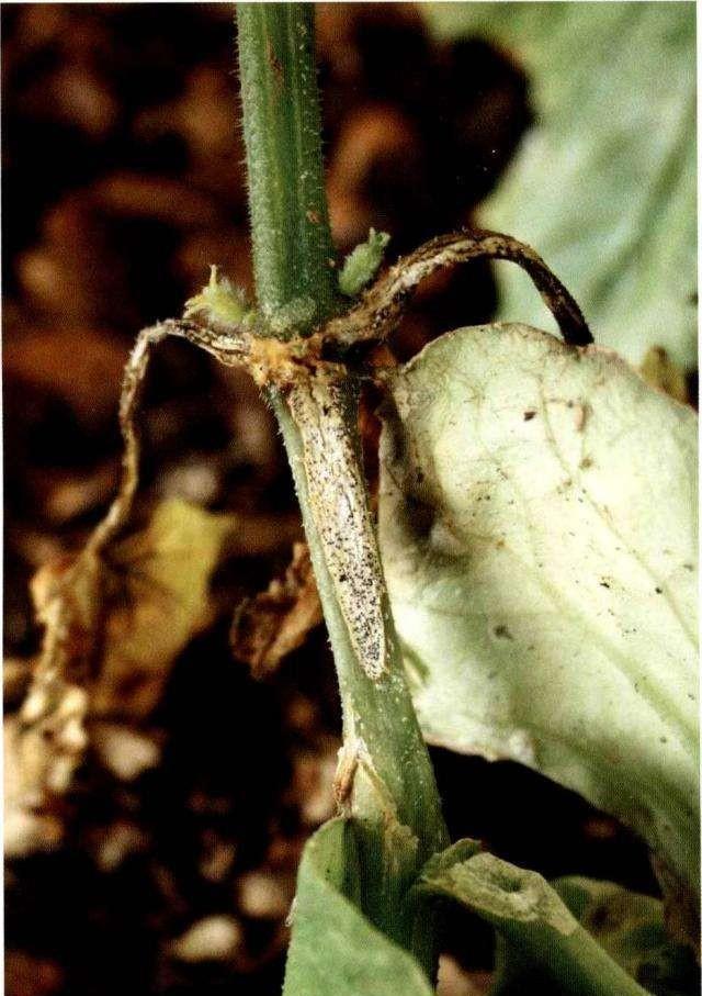 近年,茎叶发病增多,茎蔓上病斑椭圆形或长圆形,黄褐色,稍凹陷,有琥珀色胶质物溢出,严重时病斑连接或包围主茎,致使病部以上茎枯死。